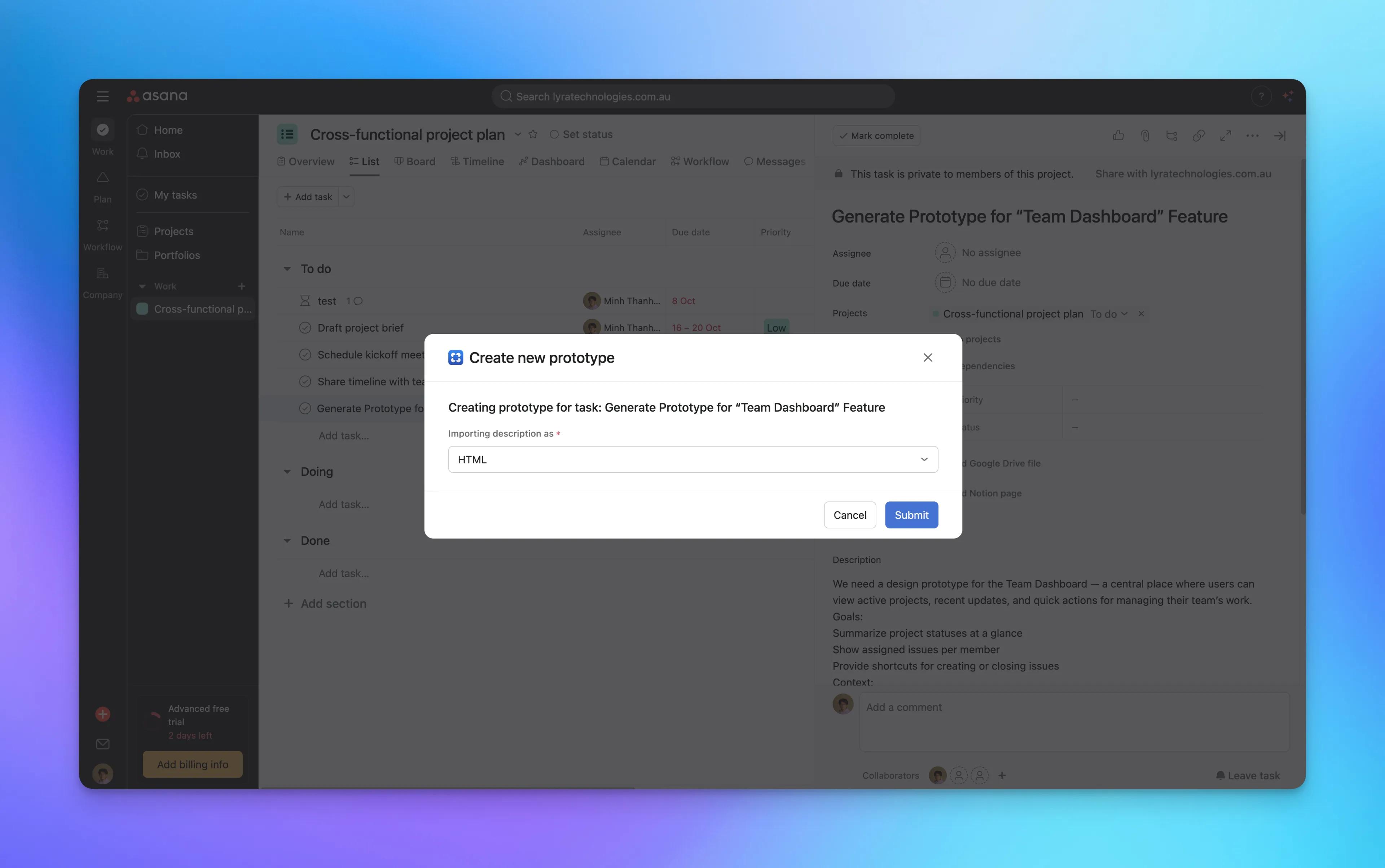With Alloy, you can quickly iterate on ideas and share clickable prototypes with stakeholders for feedback. For example, a product manager can select a feature request from Asana, describe the desired behavior, and Alloy will generate a visual mockup that reflects the request. This streamlines the design process, reduces handoff friction, and ensures your prototypes stay aligned with real Asana tasks.