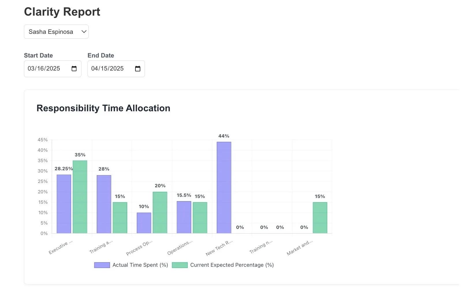 - This report aggregates all your check-ins into a clear view of how you’re spending your time and progressing in your role