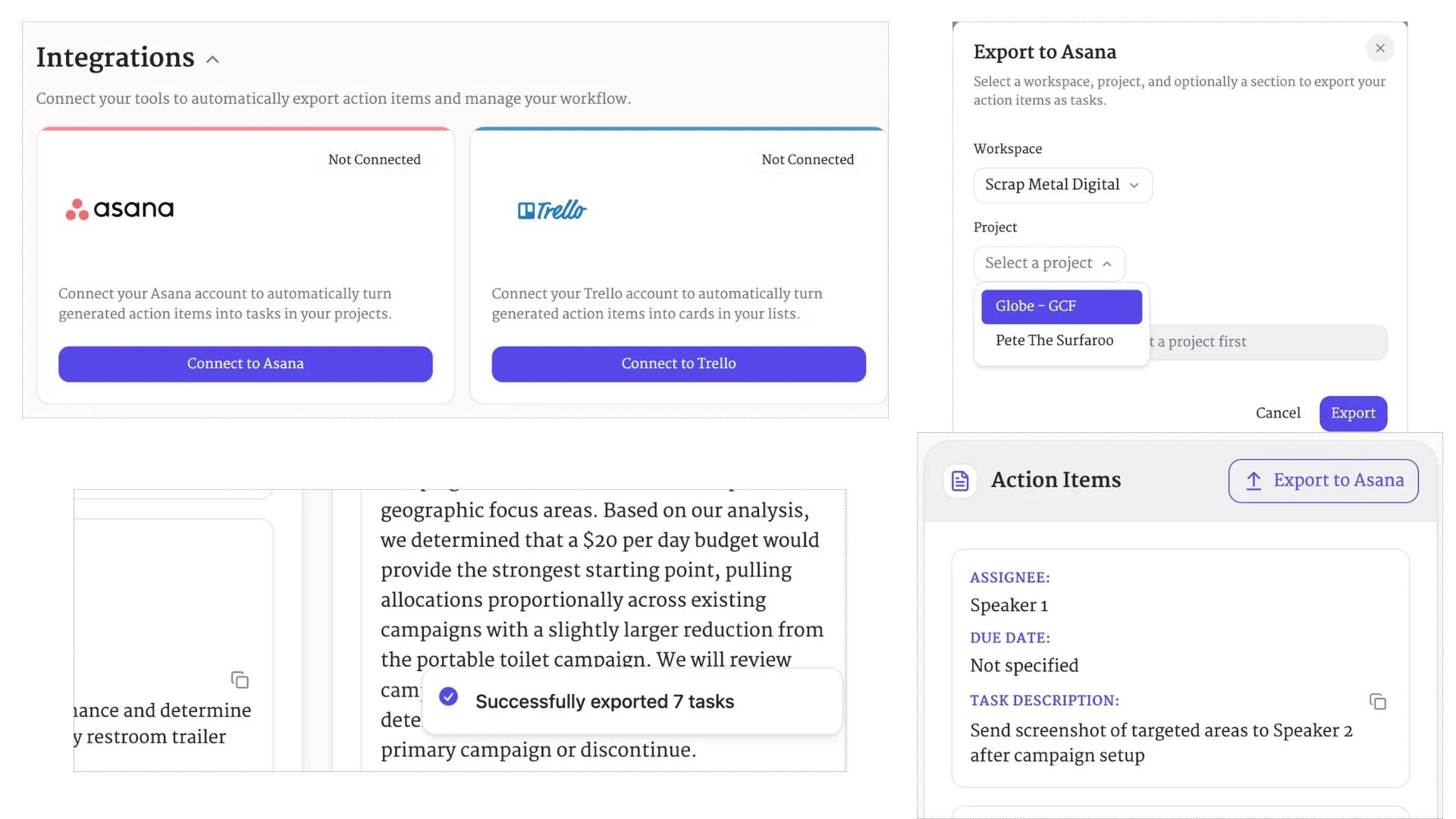 The action items that Donezo generates out of the box are able to be copied and pasted into any Scrum or project management software, however, premium customers are able to connect directly with their Asana workspaces to generate a one-click export to the desired workspace, project, and section. This dramatically cuts down the time it takes from discussing in a meeting to teams taking action.