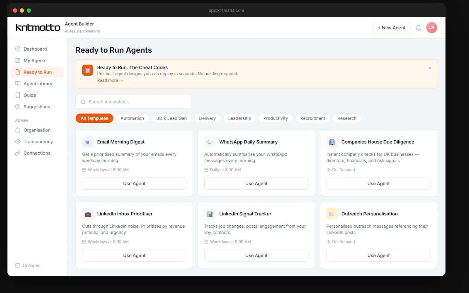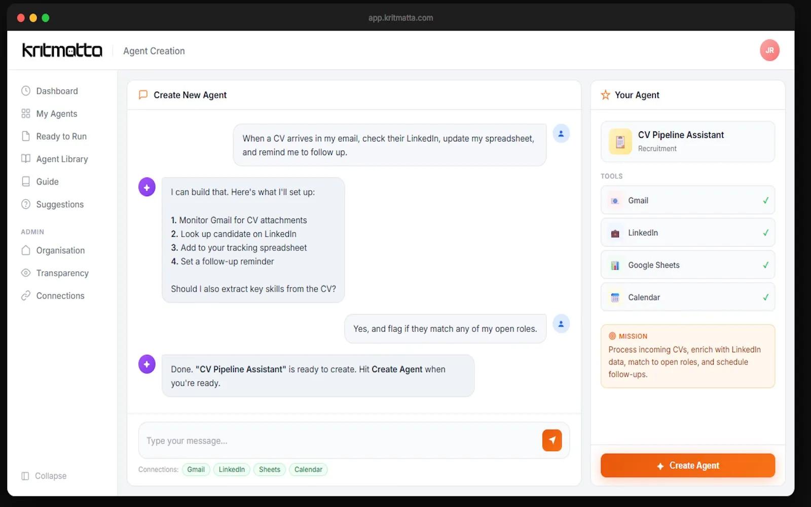Kritmatta enables teams to integrate Asana as a shared connector, allowing authorized agents to support task coordination and project follow-up. Once connected, teams can incorporate Asana into broader automated workflows. By allowing Kritmatta agents to take direct action in Asana as part of daily operational processes, this integration significantly reduces manual administration.