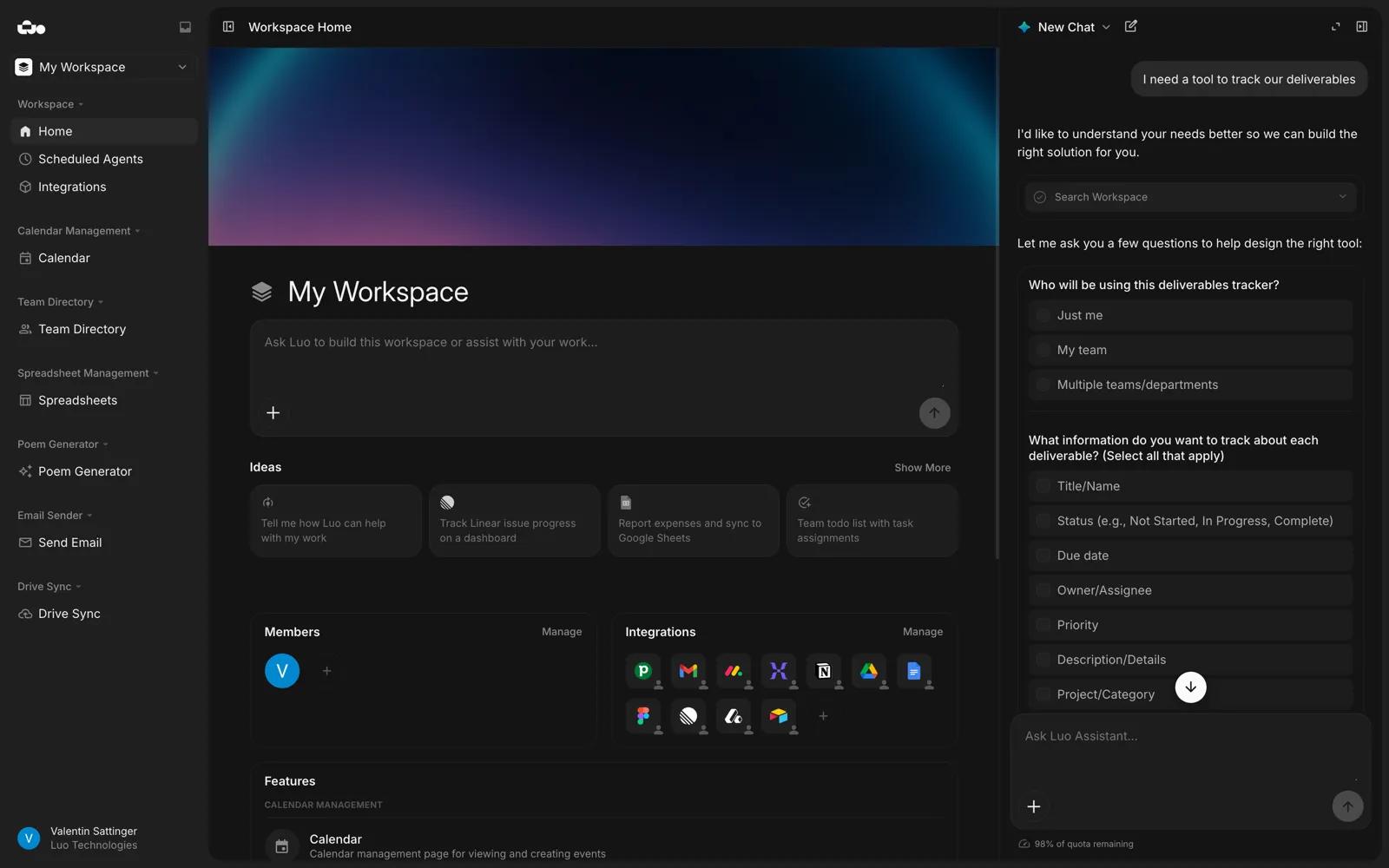 Luo is an AI-powered platform that lets you automate tasks and build custom tools and interfaces using natural language. Connect your Asana workspace to manage projects, tasks, sections, comments, and tags - all from within Luo's intelligent workspace. With the Asana integration, you can create and update tasks, search across workspaces, organize work into sections, and orchestrate workflows alongside your other business tools like Google Workspace, Slack, Linear, Figma, and more. Luo's AI assistant understands your intent and takes action across all your connected tools, so you can focus on the work that matters.