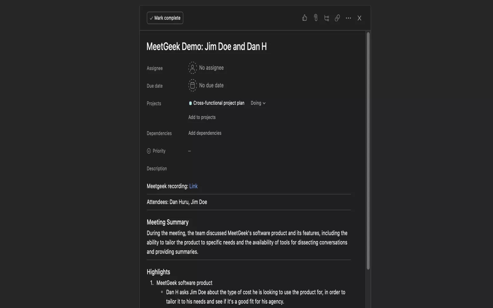 - By integrating MeetGeek with Asana, you no longer need to take notes during client calls as you can concentrate on the conversation and deliver high-quality follow-ups.