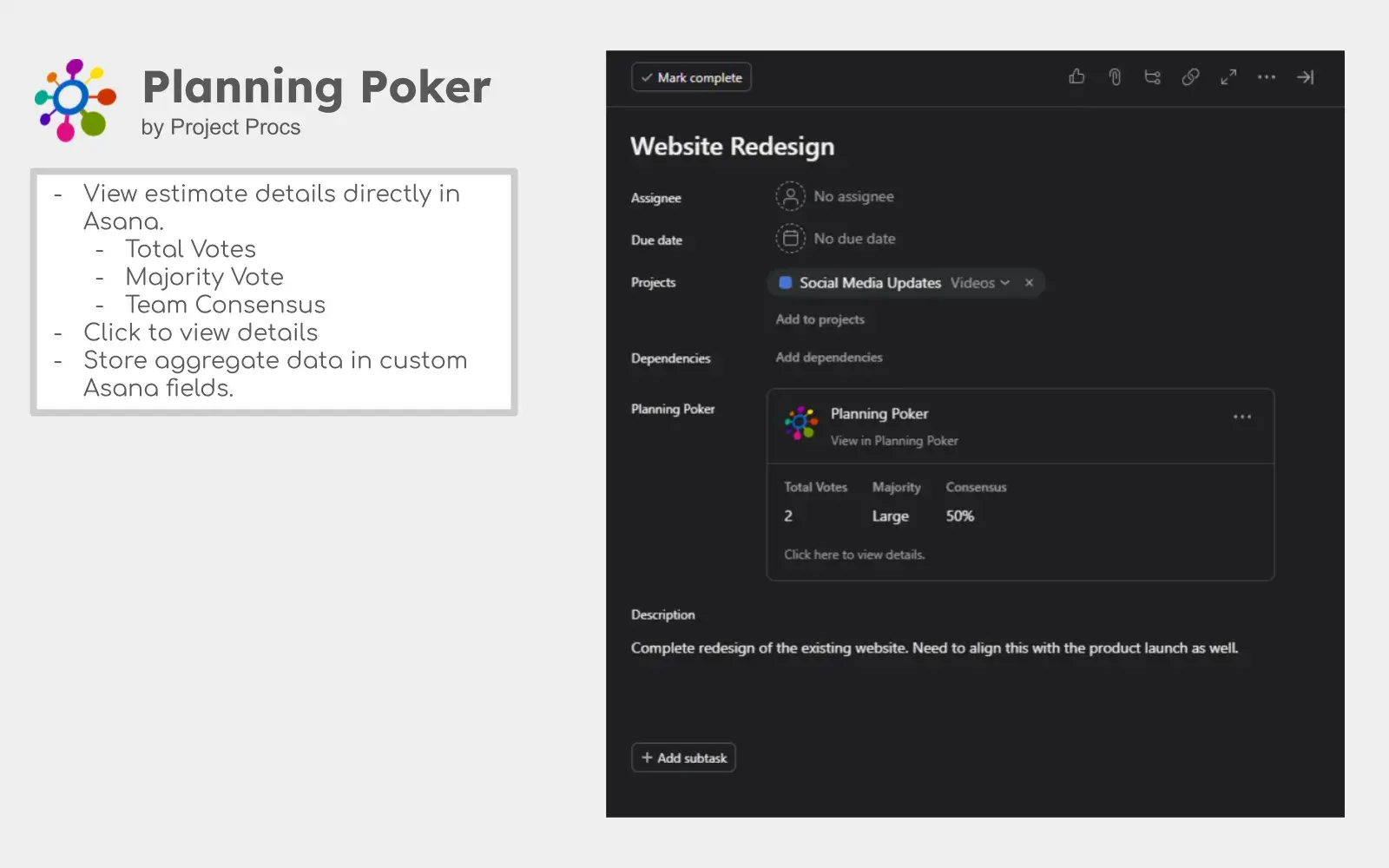 Streamline your team's task estimation in Asana by quickly collecting and displaying consensus-based estimates during planning sessions.