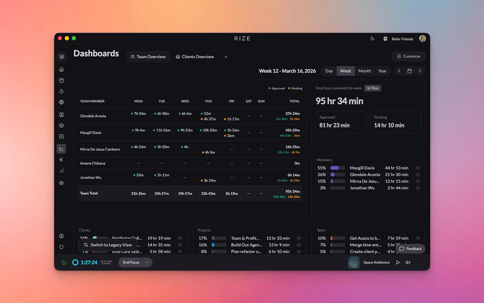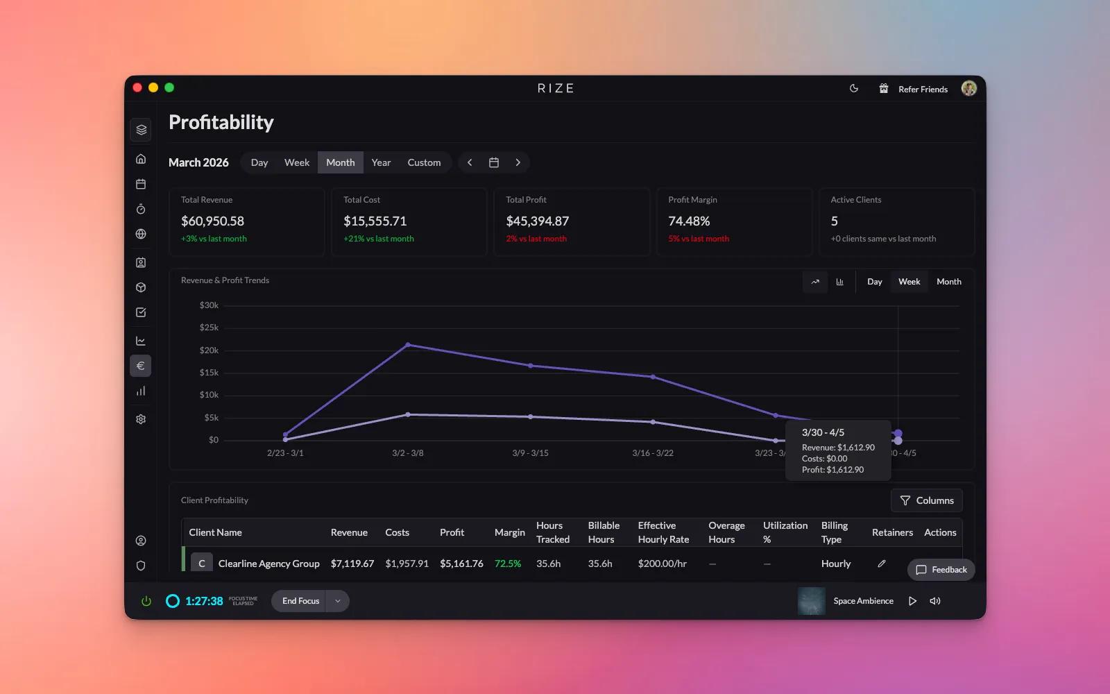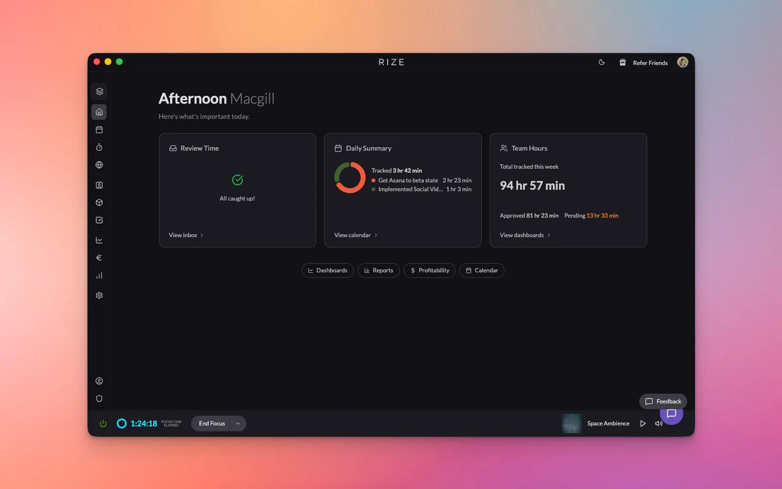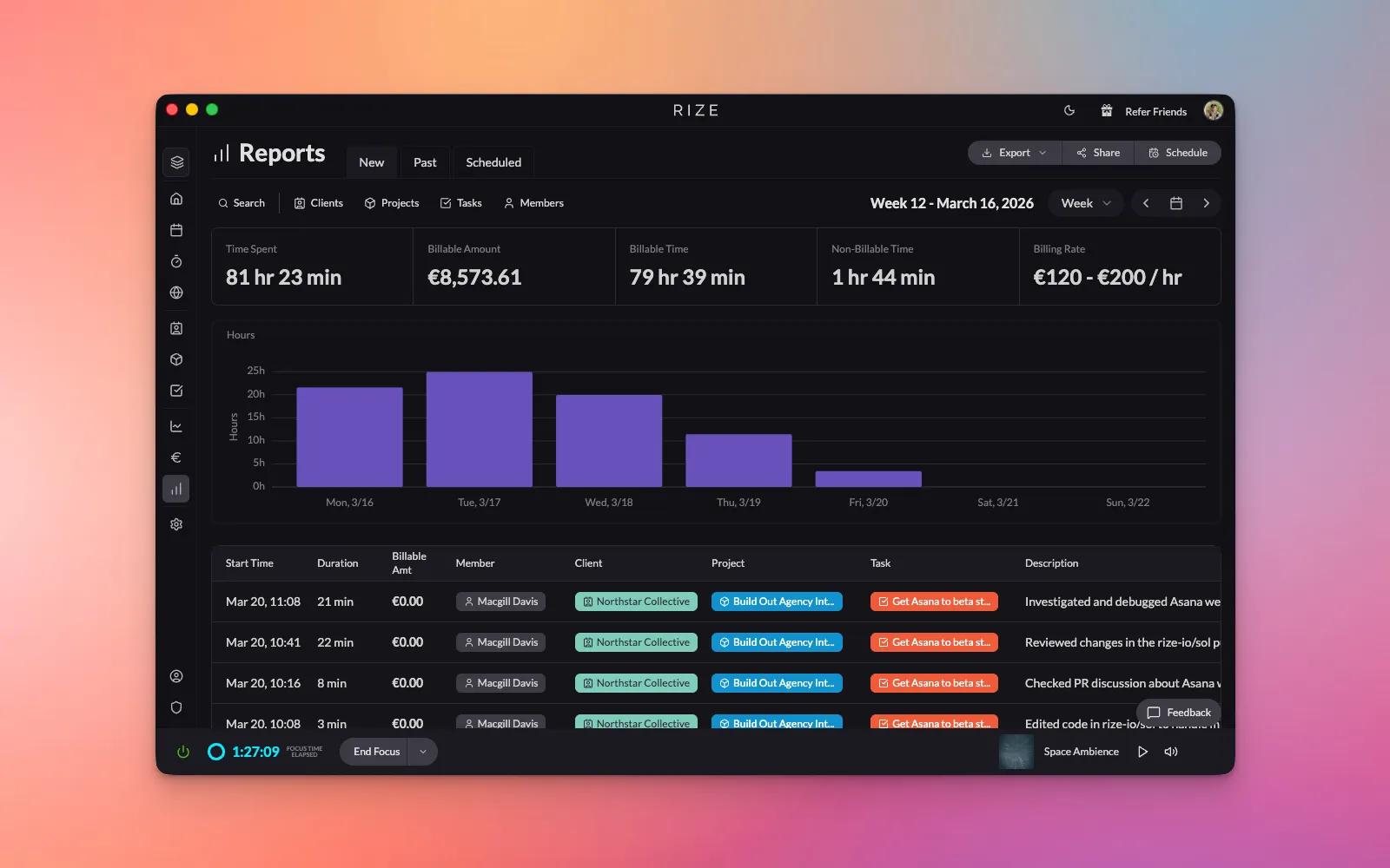 With Rize, you can automatically track time, reduce admin work, and gain real-time insights into team productivity, workload, and utilization. See time spent per client or project, improve planning with accurate historical data, and power billing and profitability reporting.