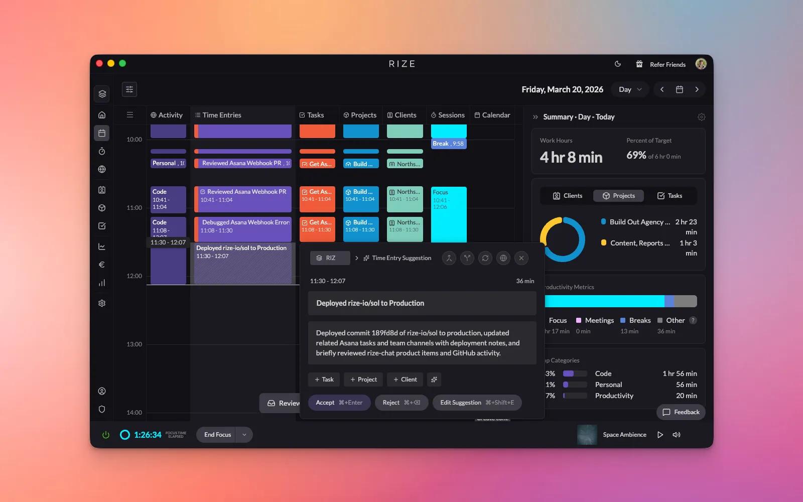 Once connected, Rize runs in the background and captures time spent on Asana work, mapping it to the right projects and tasks for a complete, accurate view of activity.