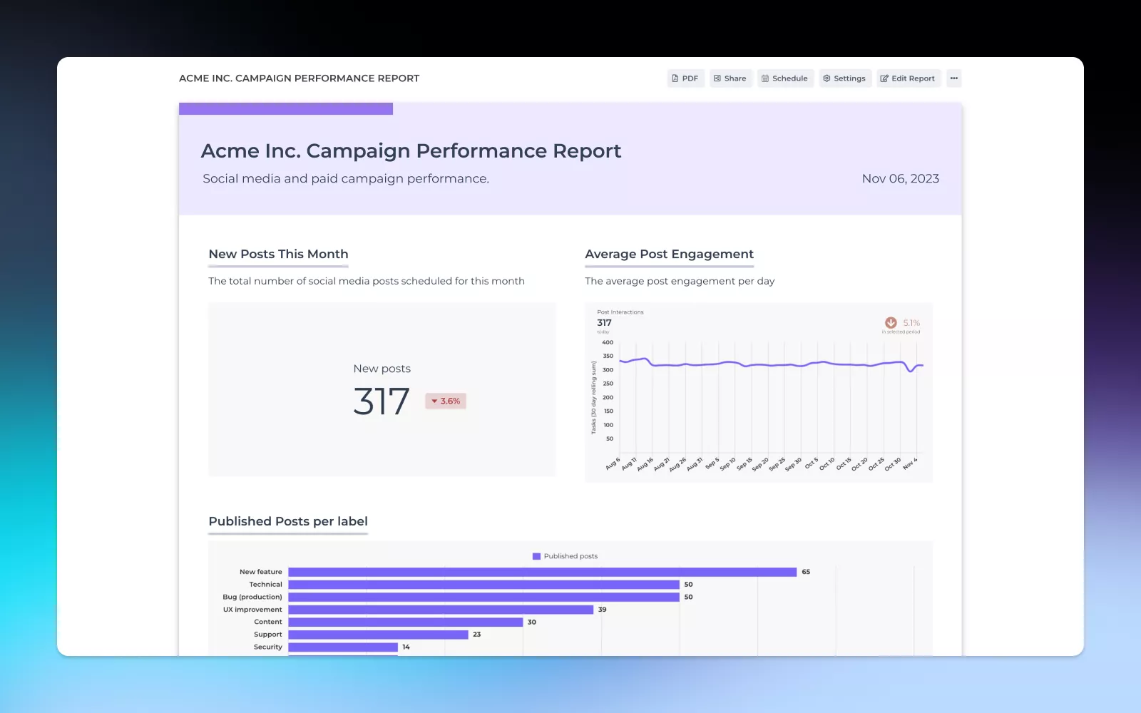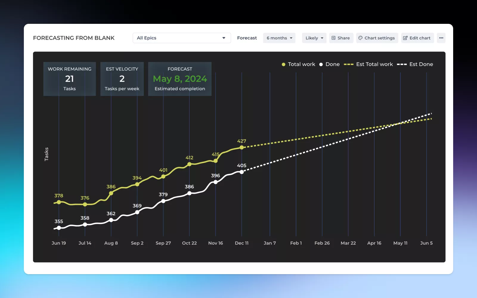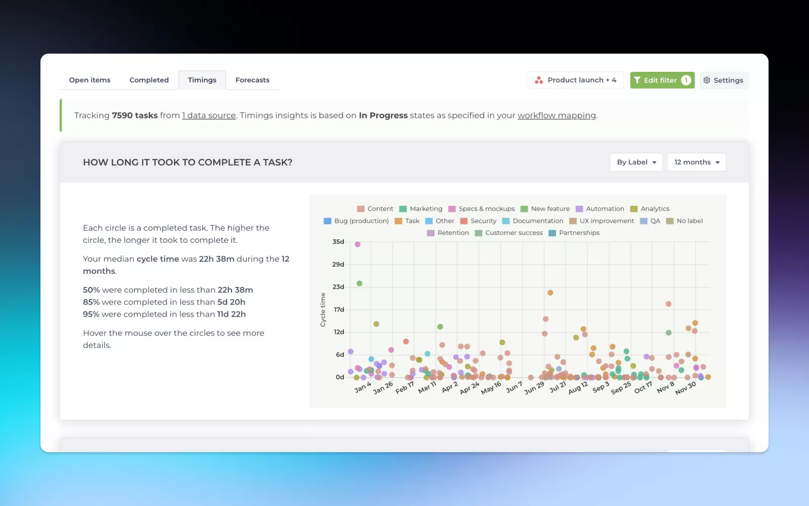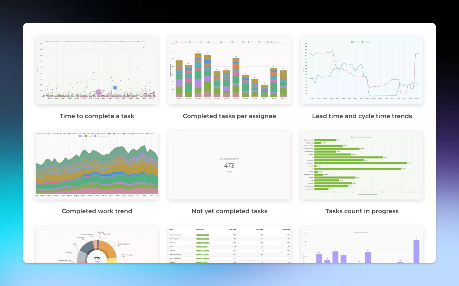 Advanced charting and automated productivity insights from your Asana data. Track lead and cycle times, planned vs actual, team velocity, and more. Create charts and reports, and share them via email or Slack.