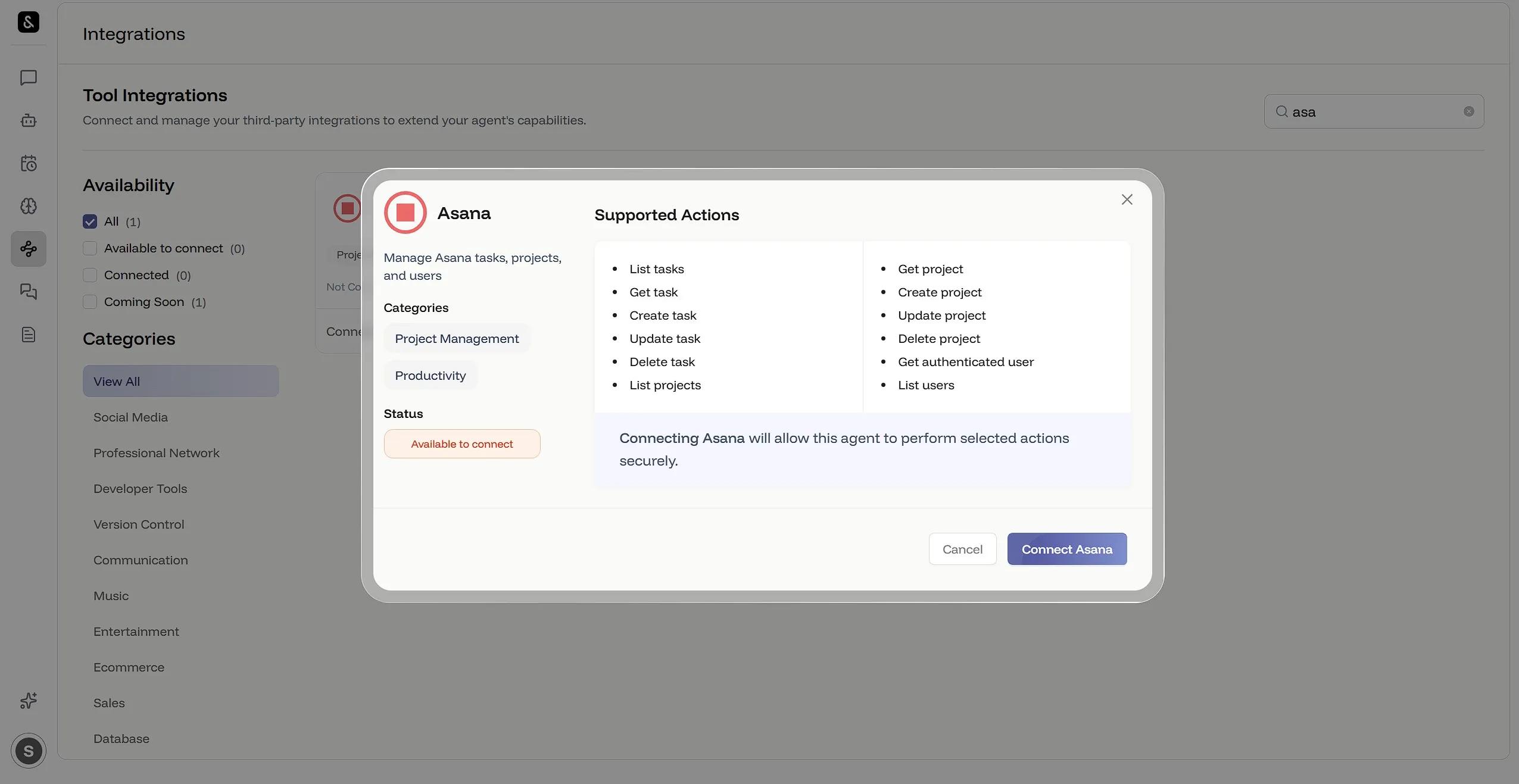 Note: If Asana does not appear in the integrations list, users may need to confirm with their Supervity organization admin that integrations are enabled.