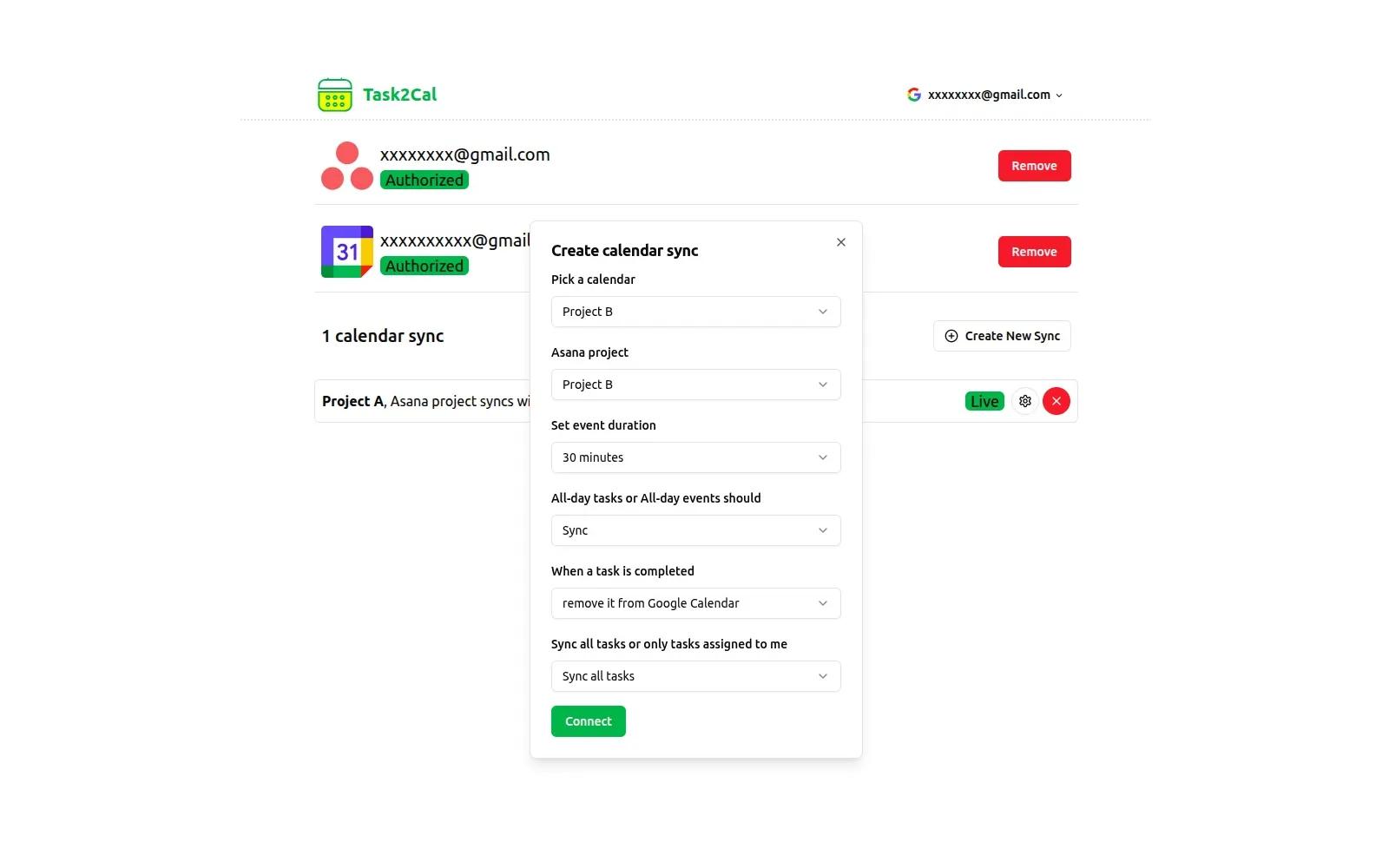 You can choose one project or all projects in Asana to sync with a calendar, set default event duration for tasks from Asana or set to delete Google Calendar event when the task is completed.