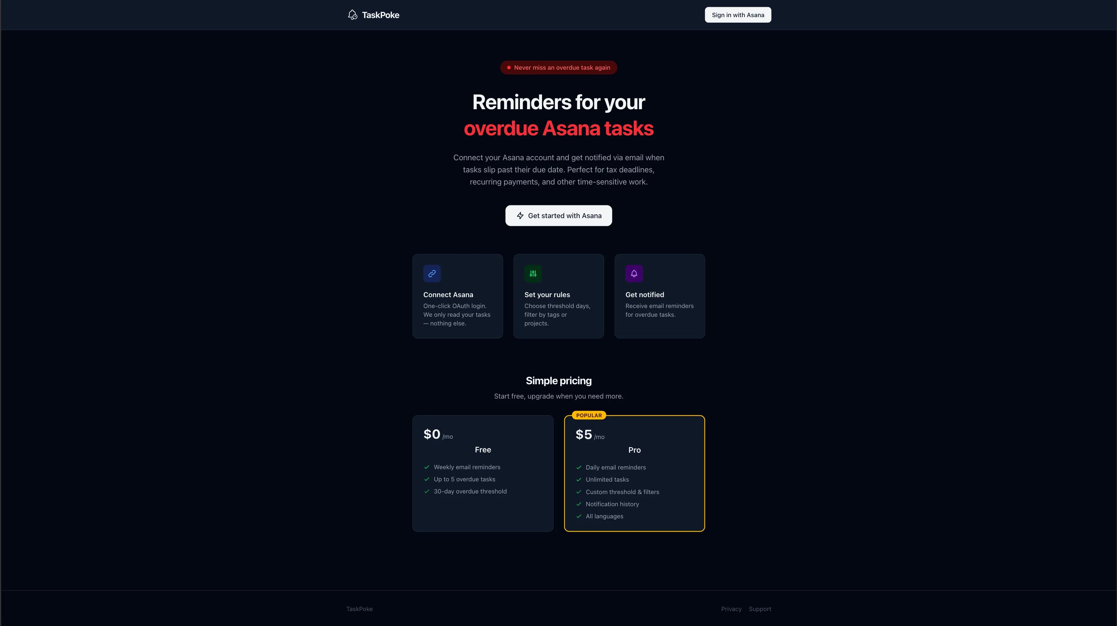 TaskPoke sends you email reminders when your Asana tasks slip past their due date, so you never miss tax deadlines, recurring payments or other time-sensitive work. Stay on top of overdue work without manual checks. TaskPoke runs in the background and pokes you when tasks need attention.