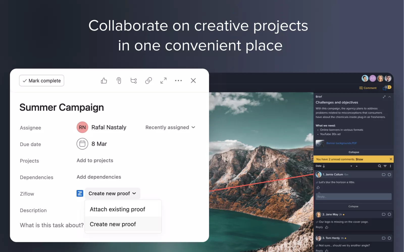 Your creative team can create a proof in Ziflow directly from within an Asana task. Or your team can connect Asana tasks with the proofs in Ziflow that they correspond to, simply by selecting from a drop-down menu. Progress and status updates are synced in real-time across platforms, so you’ll always have a single source of truth in your preferred project management software.