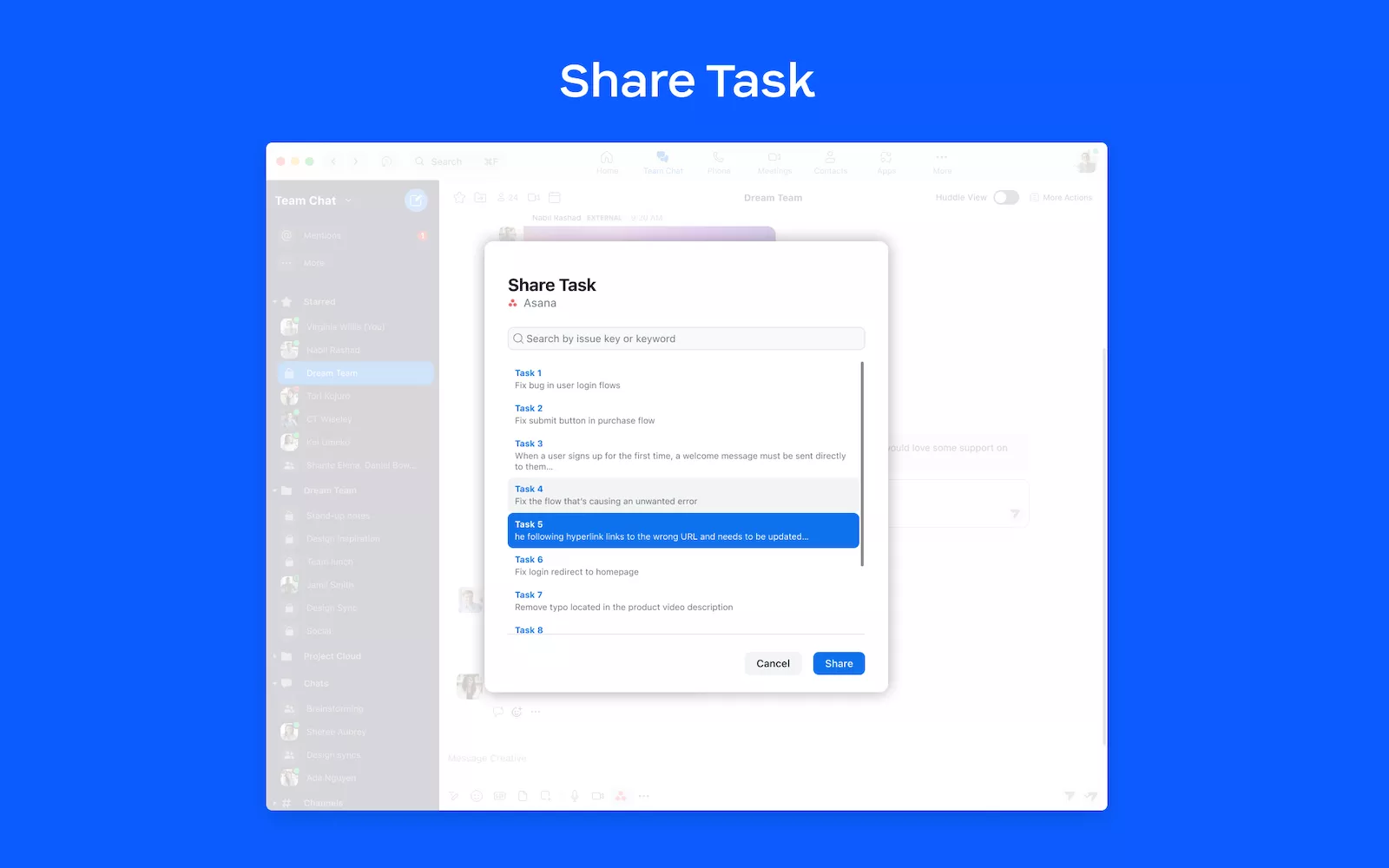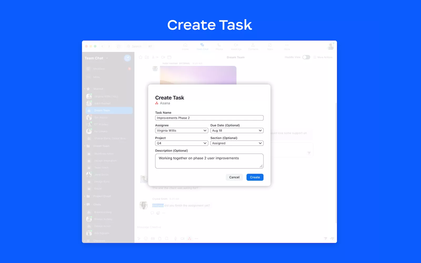 - You can see the task details, complete the task, change the assignee and due date, add it to a project, or open in Asana within Team Chat.