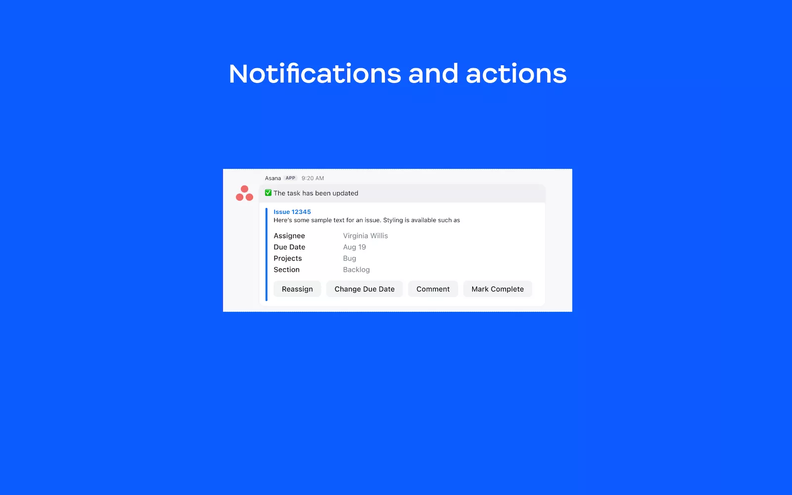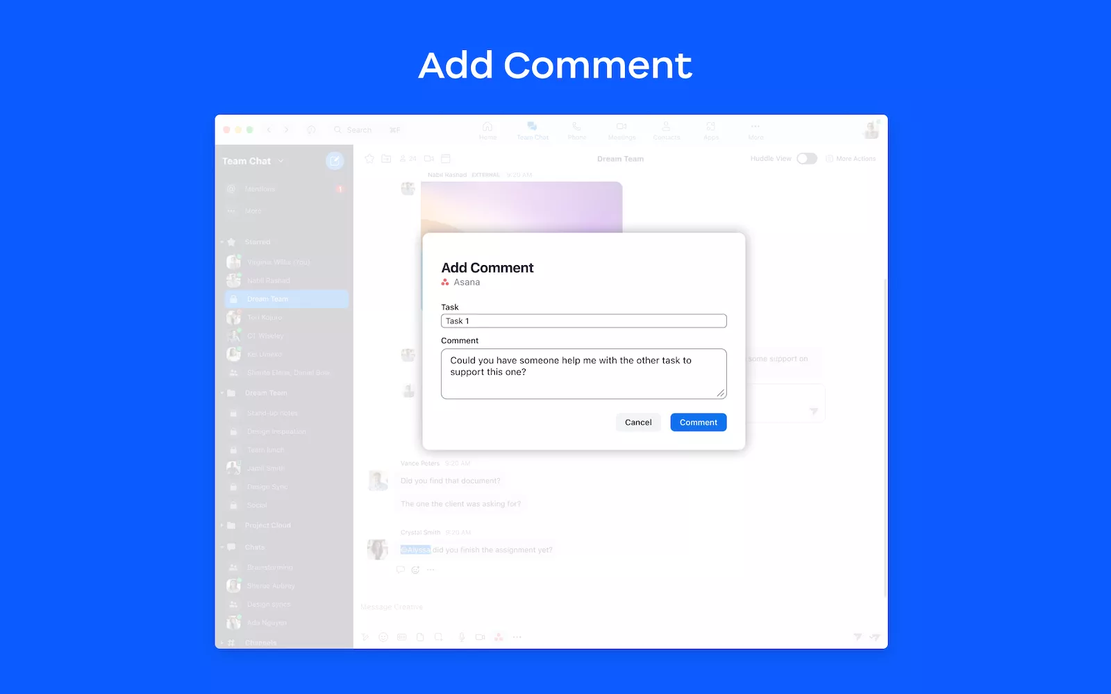 - Create a task in Asana or add comments to an existing task from chat messages.