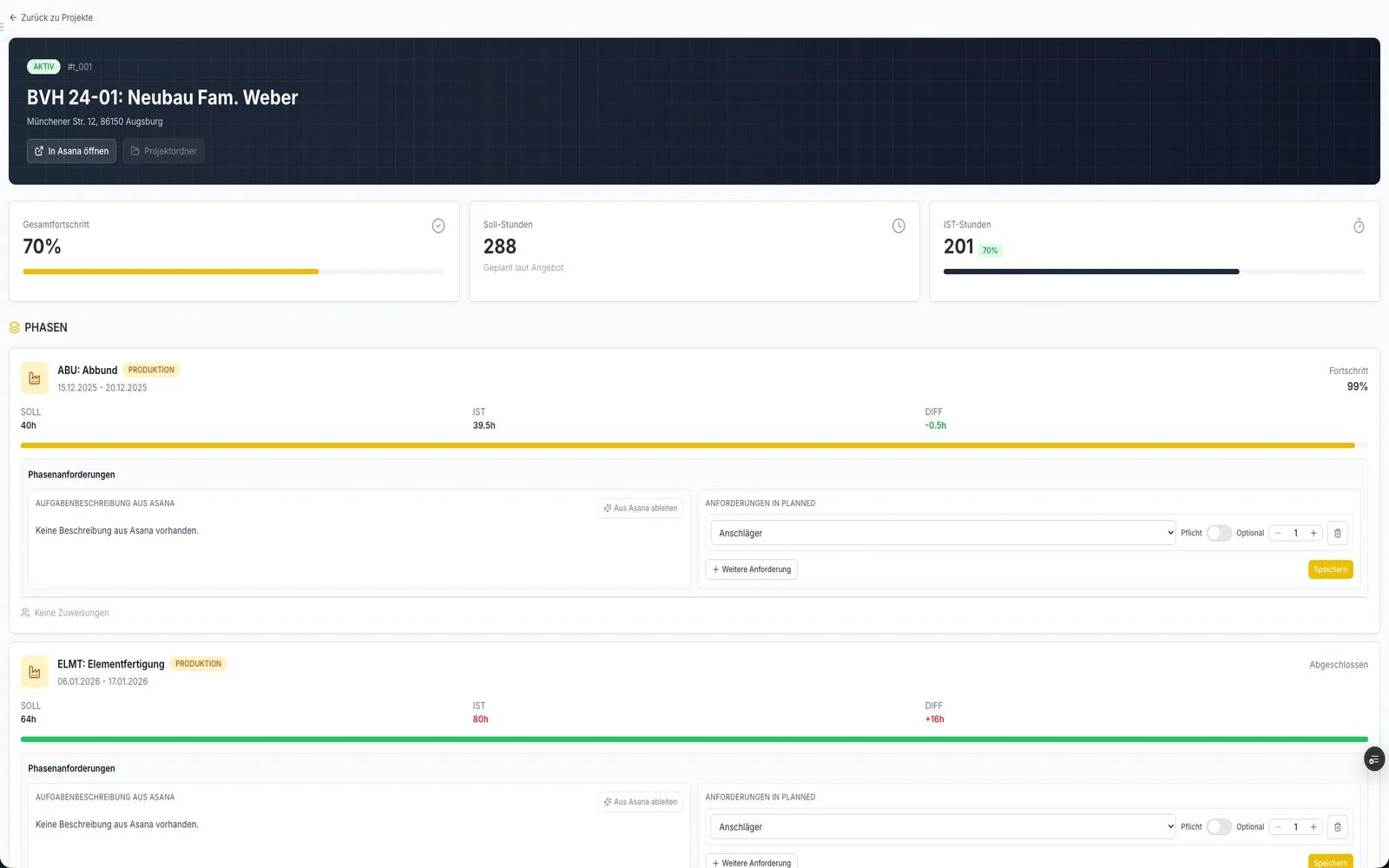Synchronisiere Projektphasen, Soll-Stunden und Abwesenheiten aus Asana mit planned und vereinfache die Kapazitätsplanung für dein Holzbauunternehmen.