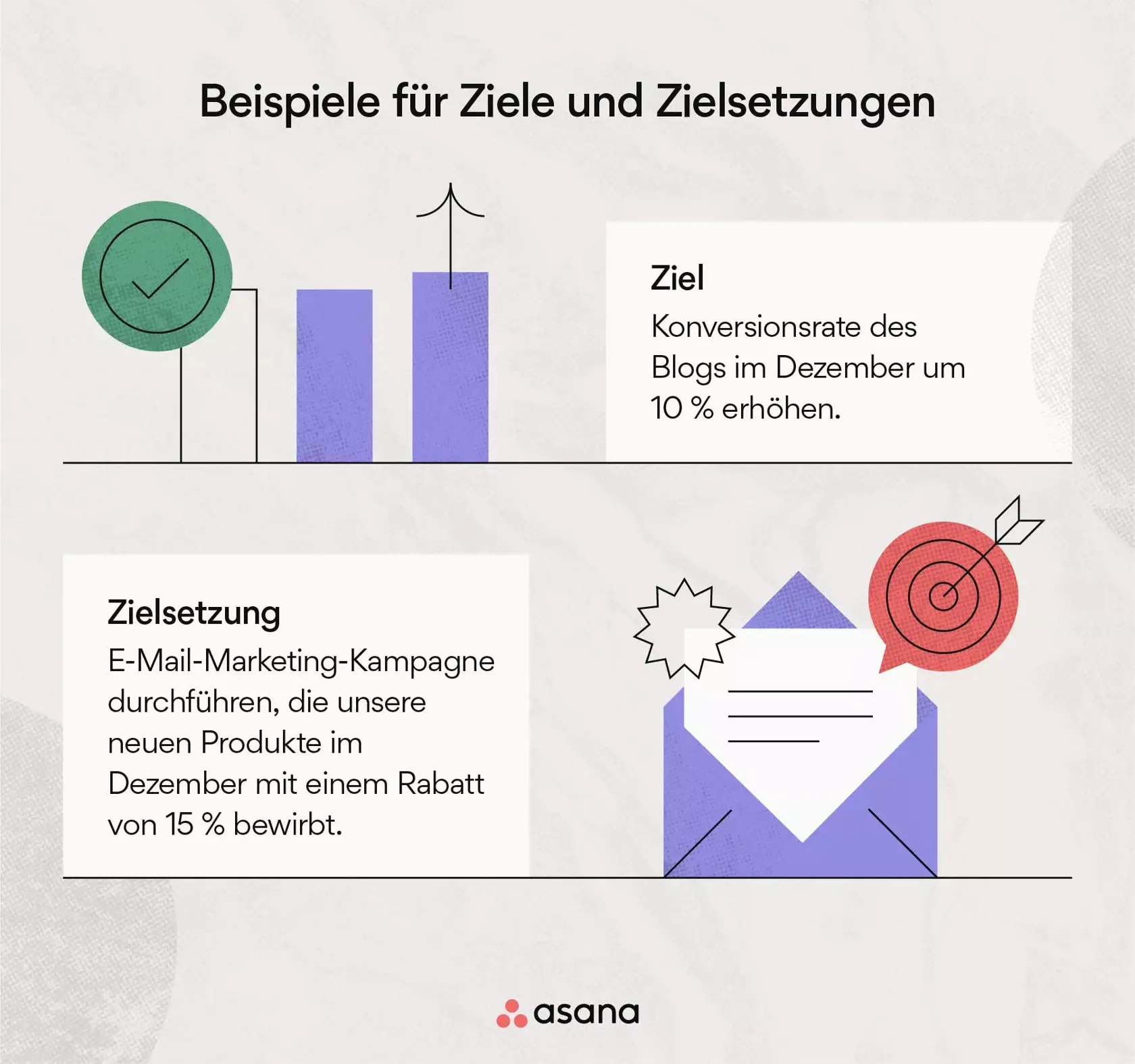 Ziele mit Asana setzen und erreichenDie folgenden drei Beispiele zeigen auf, wie Zielsetzungen und Ziele zusammenhängen, obwohl sie doch sehr unterschiedlich sind.
