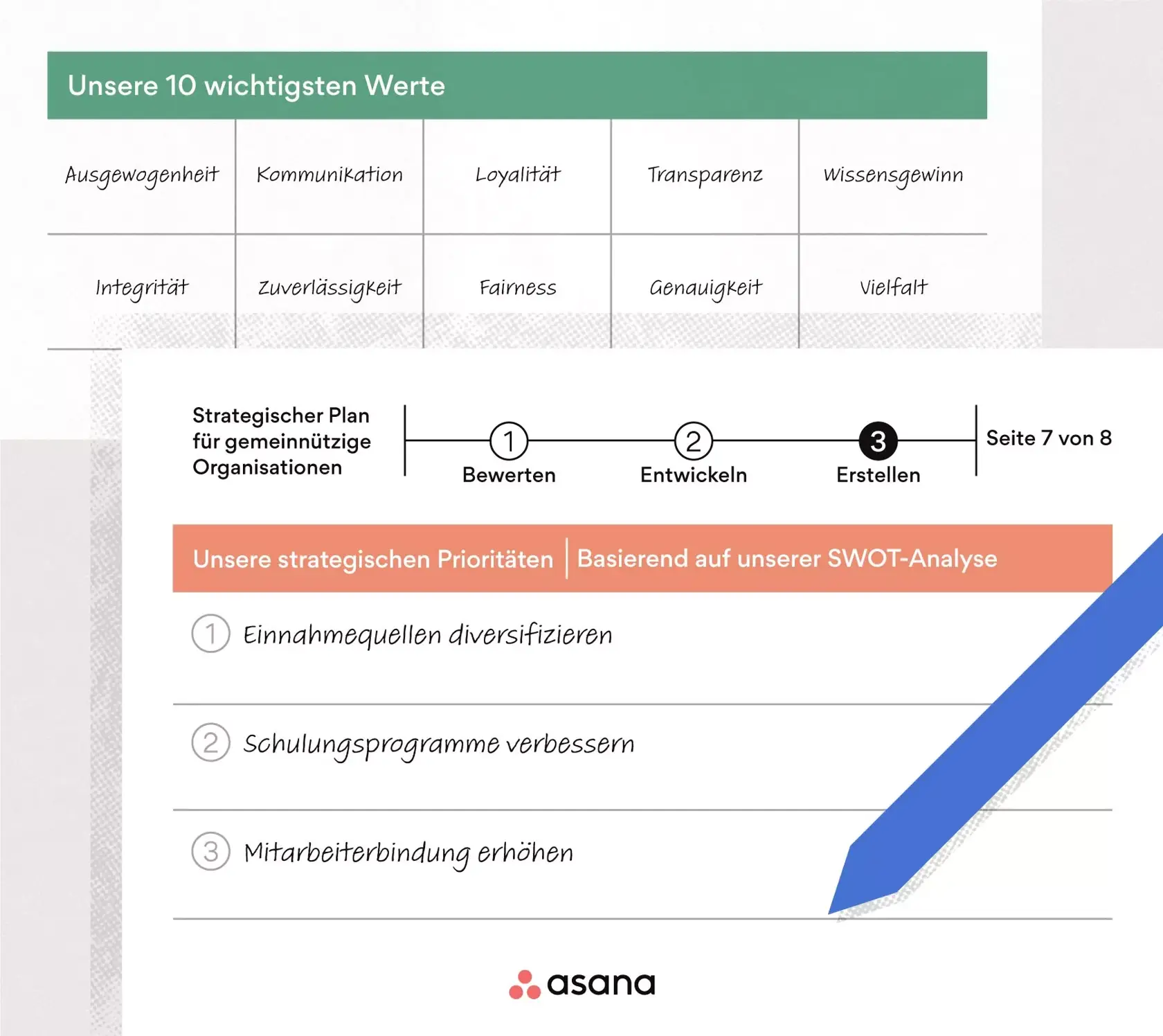 Ziele mit Asana setzen und erreichenGanz gleich, ob Sie zum ersten Mal eine Non-Profit Strategie erstellen oder Ihren bestehenden Plan aktualisieren, ist es wichtig, dass Sie die richtigen Personen in diesen Prozess einbeziehen. Stellen Sie ein strategisches Planungsteam zusammen, das aus leitenden Angestellten, Vorstandsmitgliedern und wichtigen Teammitgliedern besteht, die zum langfristigen Erfolg Ihrer Organisation im Non-Profit-Bereich beitragen können.