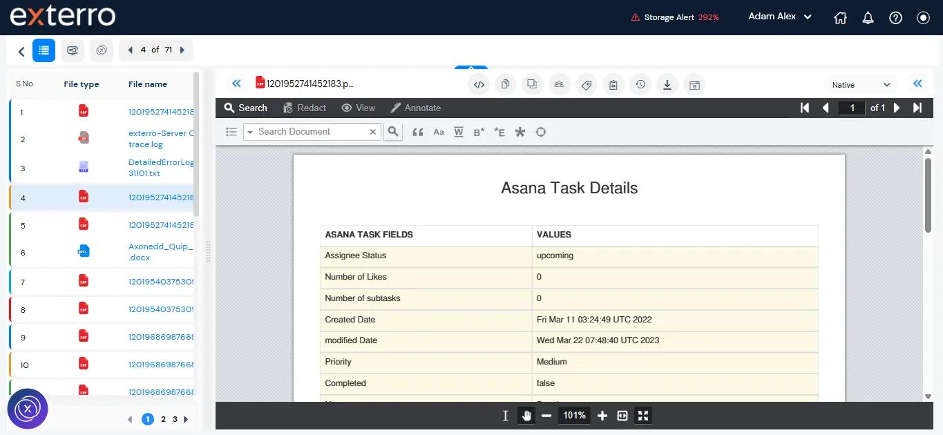 La integración de Exterro con Asana permite que los clientes recopilen con eficiencia los datos almacenados en Asana. El uso de esta integración puede reducir de manera efectiva el costo del descubrimiento electrónico (e-discovery) al permitir recopilaciones específicas. La integración permite a los usuarios recopilar únicamente un conjunto específico de proyectos junto con las tareas, subtareas y archivos adjuntos que se requieran para los litigios. La capacidad de defensa se mantiene a través de informes de auditoría de la cadena de custodia completa.
