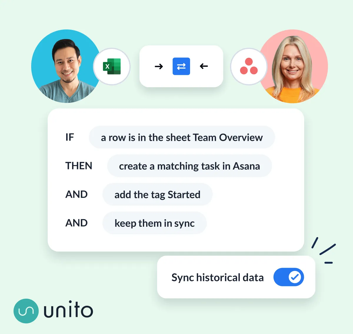 With Excel + Asana powered by Unito, you can populate Excel spreadsheets with Asana tasks, dispatch tasks from any sheet, or both simultaneously.