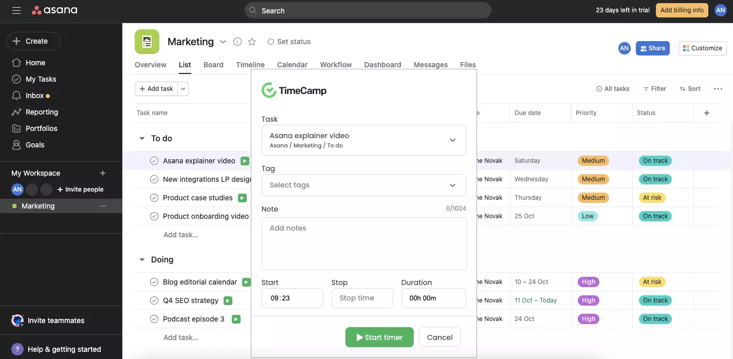 Para más información sobre cómo usar la integración de TimeCamp + Asana, consulta TimeCamp.