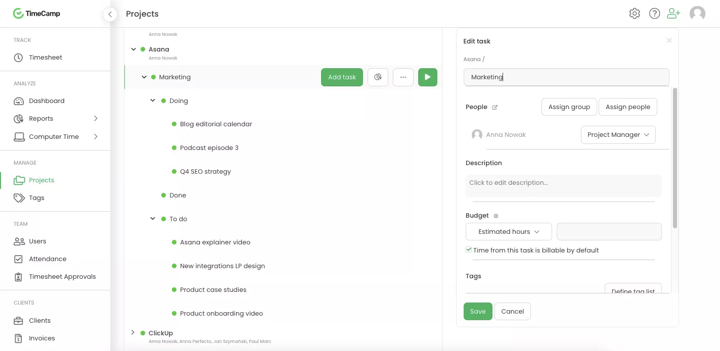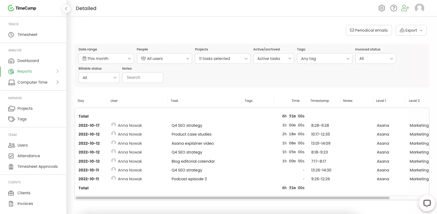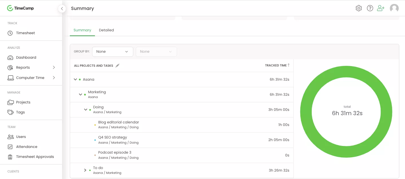TimeCamp te ayuda a comprender cómo usas tu tiempo cuando trabajas en Asana, proporcionándote datos valiosos para que puedas realizar una asignación precisa de recursos y presupuestos de proyectos. Ahorra tiempo en tareas administrativas y obtén una mejor perspectiva sobre la rentabilidad de tus proyectos.