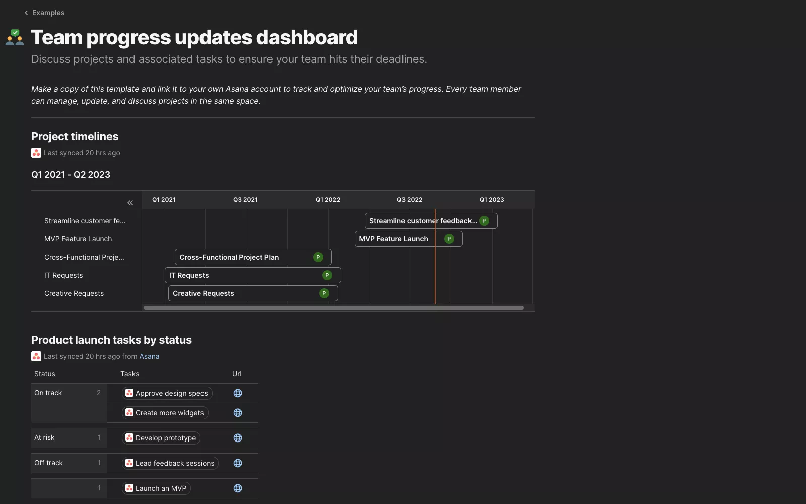 Asana Pack vous permet de mettre en place un système de suivi cohérent et des hubs d’équipe dans votre espace de travail unifié Coda. Vous vous pouvez ainsi facilement suivre la progression des projets et communiquer avec votre équipe répartie à travers le monde