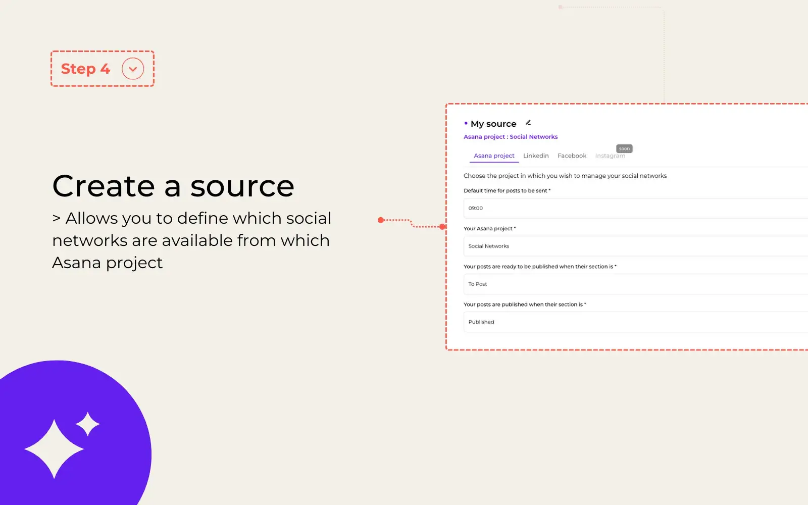 Sociana has been designed to avoid copying and pasting between content created in Asana and your social networks. It allows you to completely boost and transform Asana into a tool for publishing and managing your social networks. All you have to do is create a Sociana account and then connect an Asana project to your social networks. Then, from your Asana project, you decide on which network(s) this task will be published. Great, isn't it?