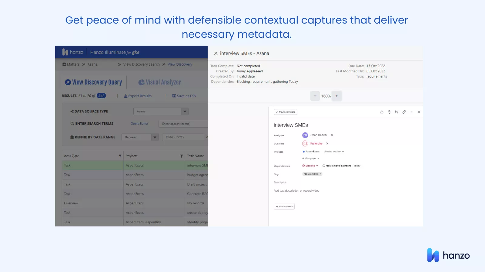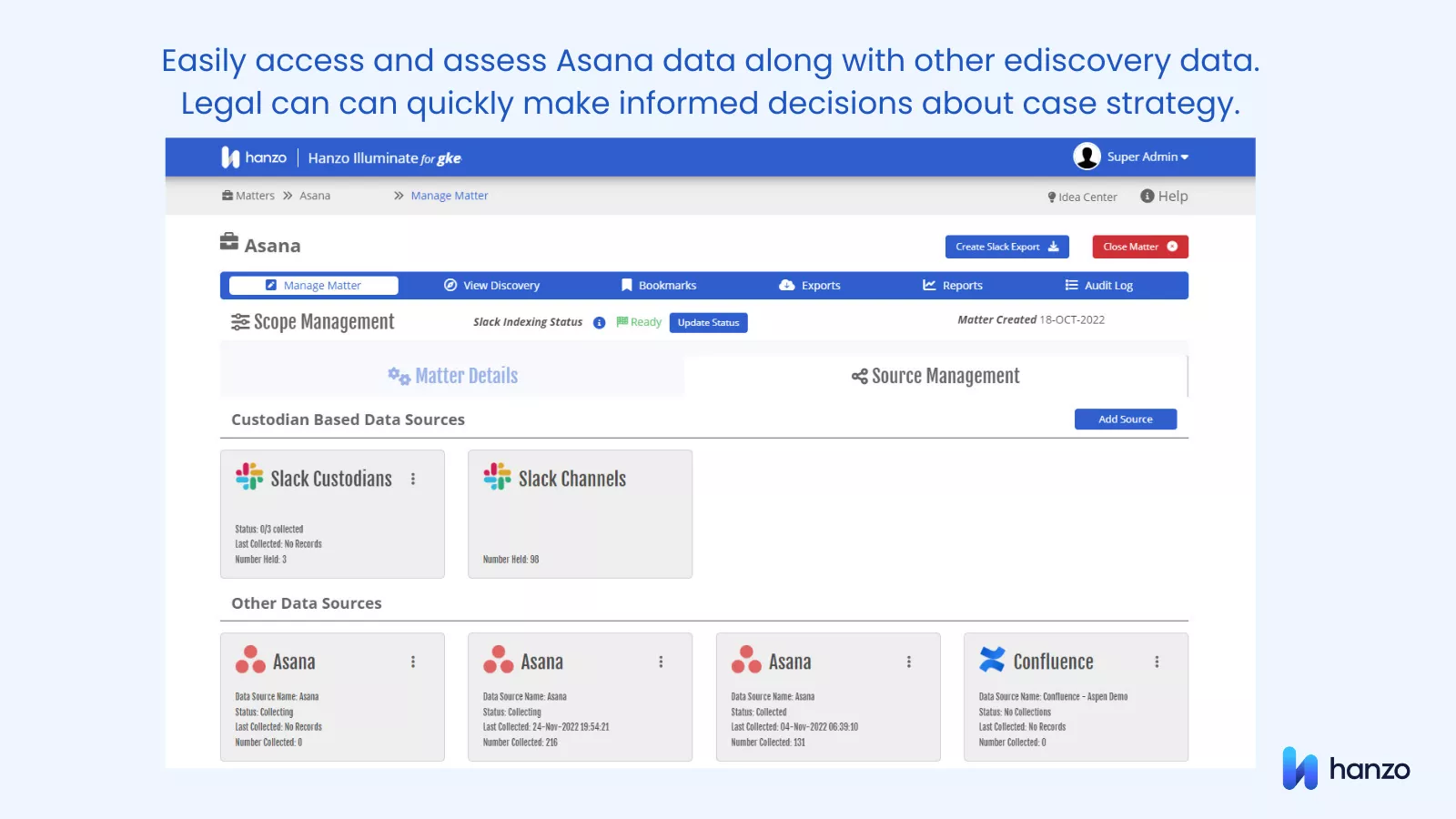 Hanzo enables companies to discover the truth in what’s happening in their workplace. Our applications integrate with the next generation of data sources, such as Asana, allowing companies to understand and control their dynamic data and respond to incidents such as litigation, investigations, and audits effectively.